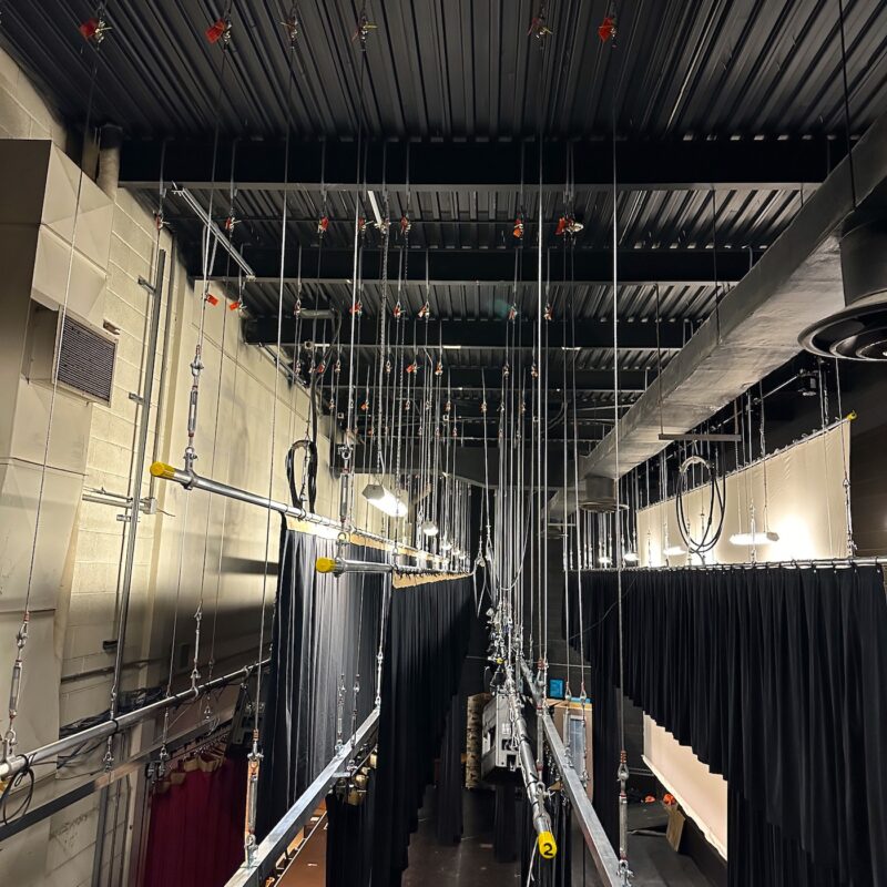 The old lighting pipes, curtain pipes, and traveller curtain tracks were all stripped out over a high school stage and replaced with a properly engineered and load-rated system that is easier to use and to inspect.