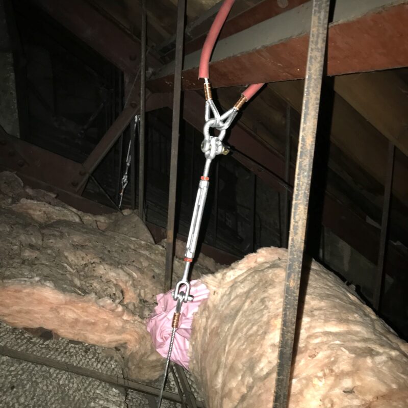Upon inspection of a Toronto theatre’s lighting grid, it was determined the method of which it was mounted made it not safe for overhead loading. The grid was re-hung on aircraft cable anchor points with turnbuckles to take the tension off the existing mounts. This allowed for an Engineer approved overhead load rating.